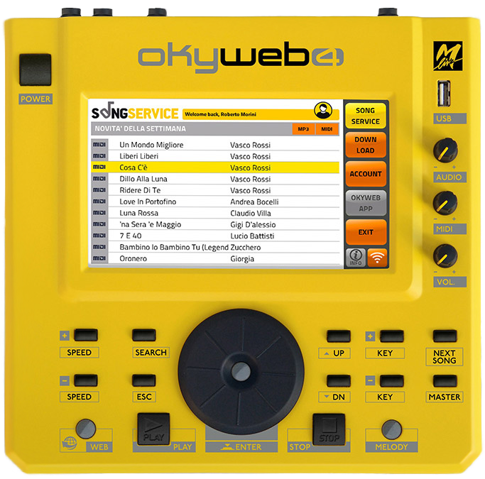 Okyweb 4 legge tutti i formati Midi e Audio Mp3, inoltre può editare i Midi File e organizzarli in archivi complessi anche tramite Playlist. Si connette alla TV o monitor PC tramite cavo HDMI, per leggere i testi e accordi in sincronismo con la musica. Okyweb 4, con la M-Live Pen Wi Fi opzionale, si connette alla rete Internet per accedere al repertorio di Basi Musicali di www.songservice.it